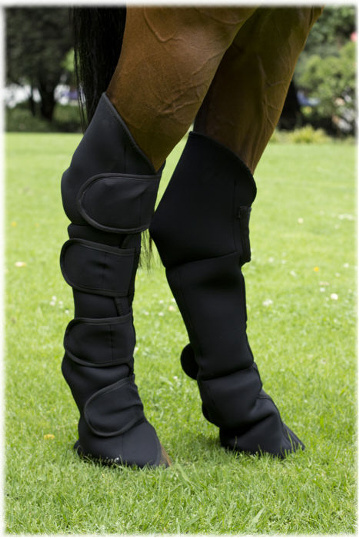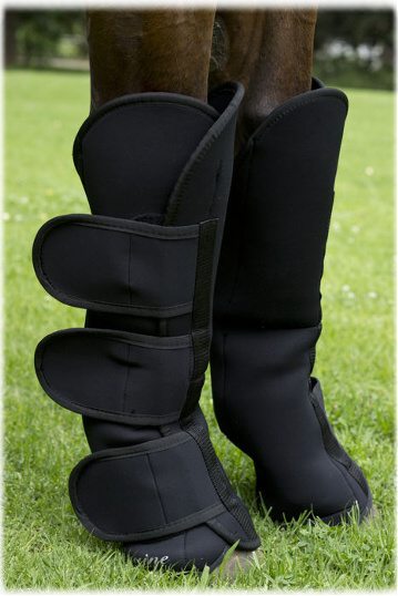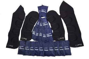 The full leg boots are sold in a set of 4 (2 front boots and 2 rear boots). The complete set comes with 20 hot/cold packs. A colour choice of black is available.