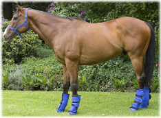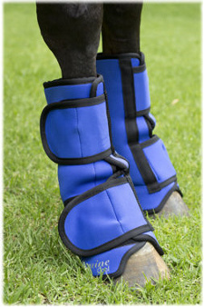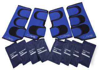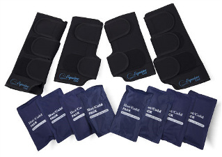 The tendon boots are sold in sets of 4 or pairs of 2 (front pair or rear pair) and come in 2 size options. Each boot comes with 2 hot/cold packs. A colour choice of black or blue is available.